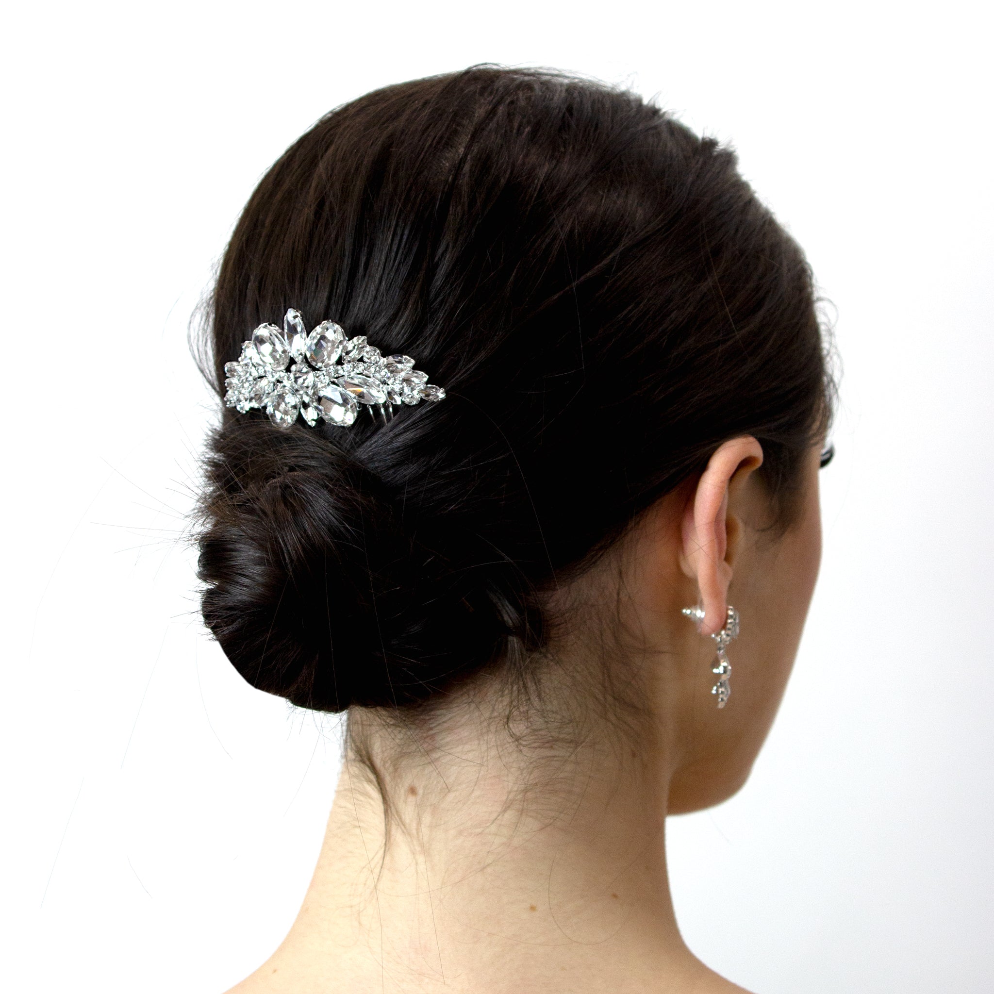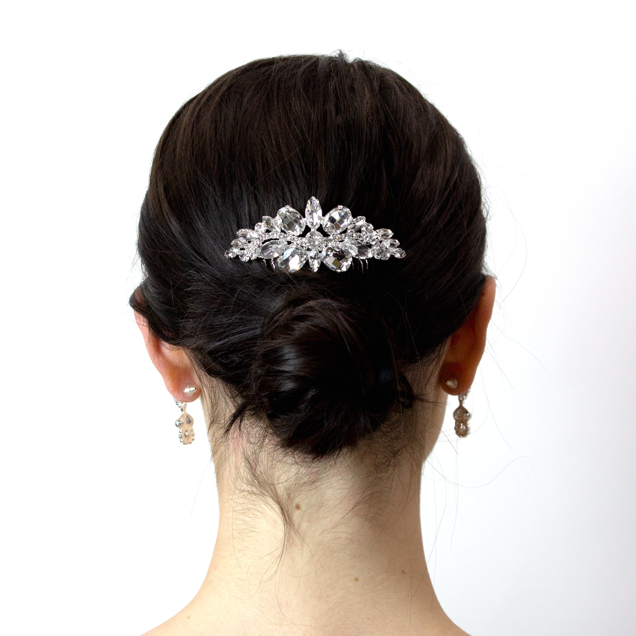 The design is approximately 2.25" x 3.25" wide. It is on a twisted wire comb. Plated in Sterling Silver. Each piece is individually wrapped in plastic.