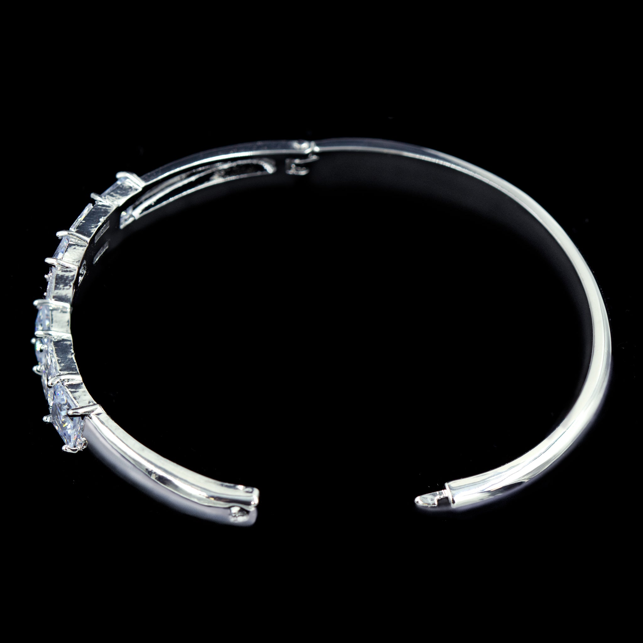 The circumference is 7.25" and the stones are cubic zirconia. There is a side clasp. Plated in Silver. Each bracelet comes in a polybag.
