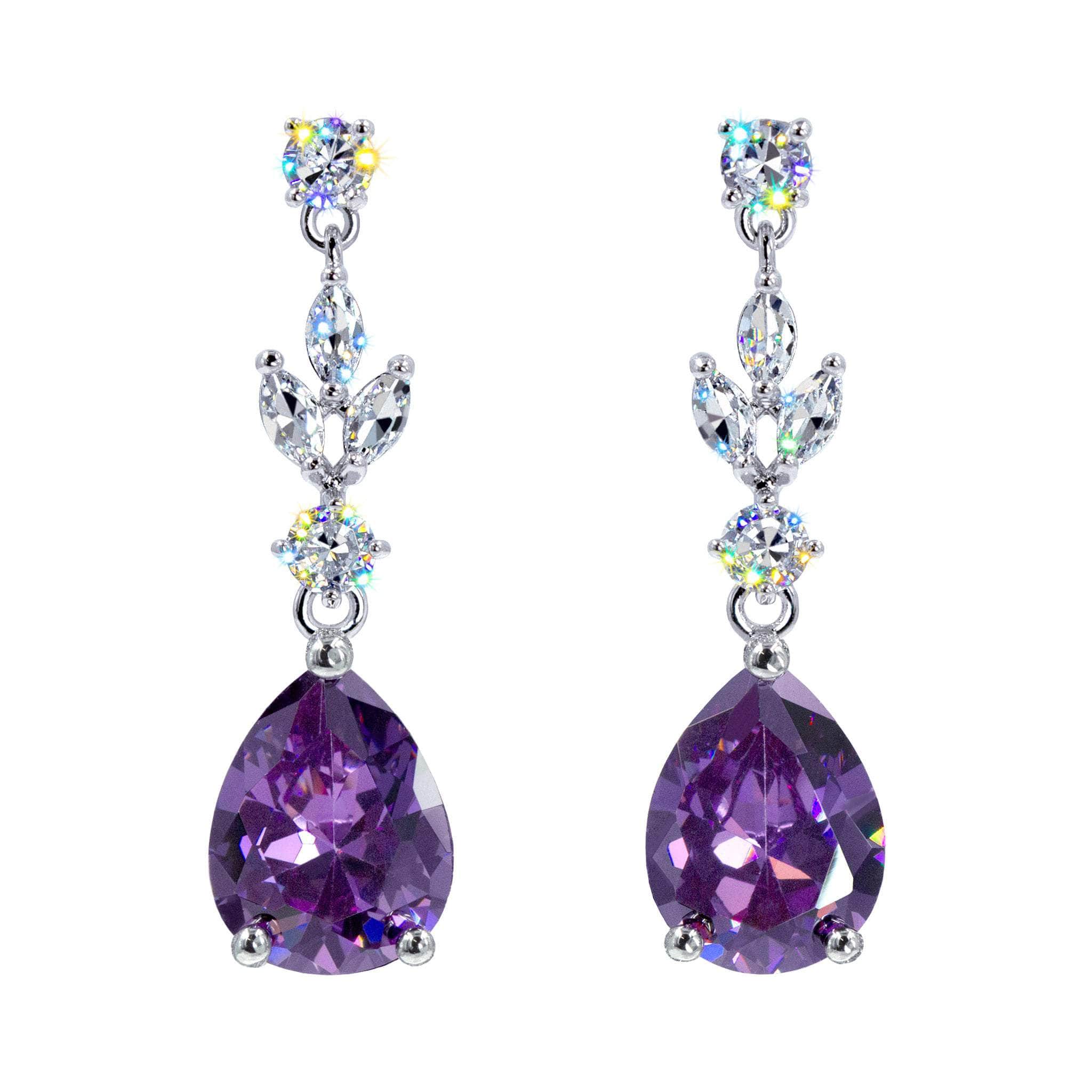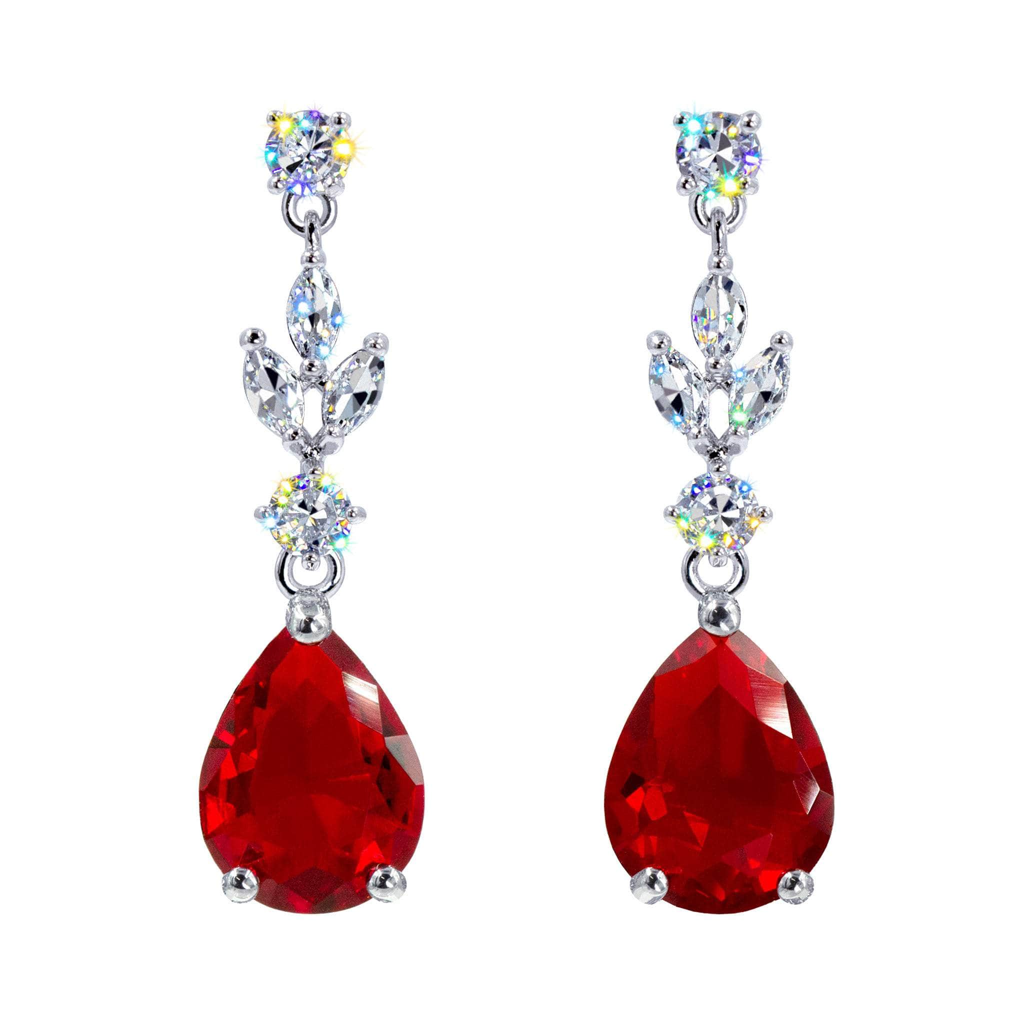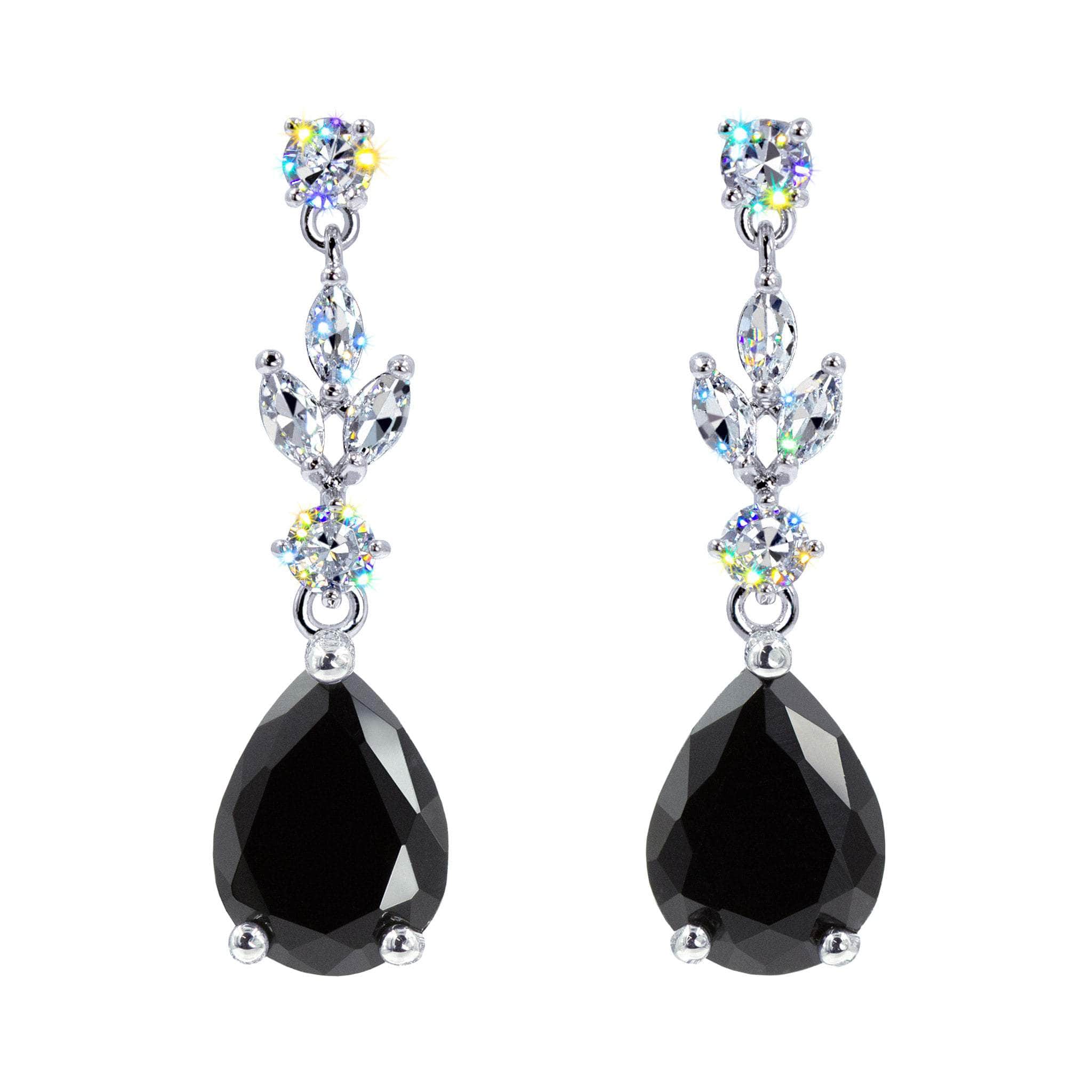 These 1.5" tall chandelier earrings feature a teardrop-shaped CZ stones as the focal point suspended from an intricate arrangement of smaller stones. The smaller stones cascade down to the larger teardrop stone have fluid movement. Plated in imitation rhodium. They exude luxury and are likely intended for formal events, adding a statement piece to an evening or gala ensemble. Carded on RJC cards and in a polybag.