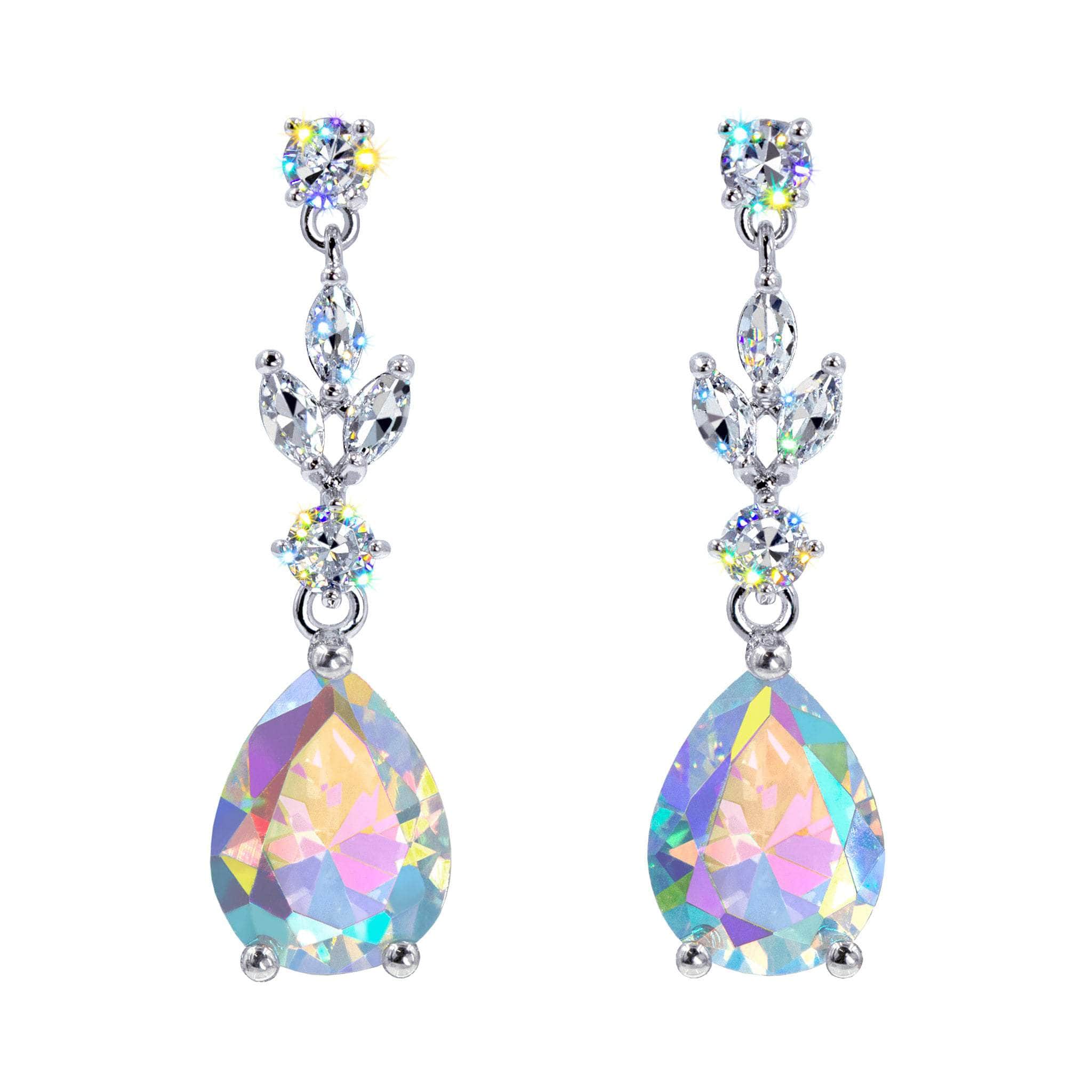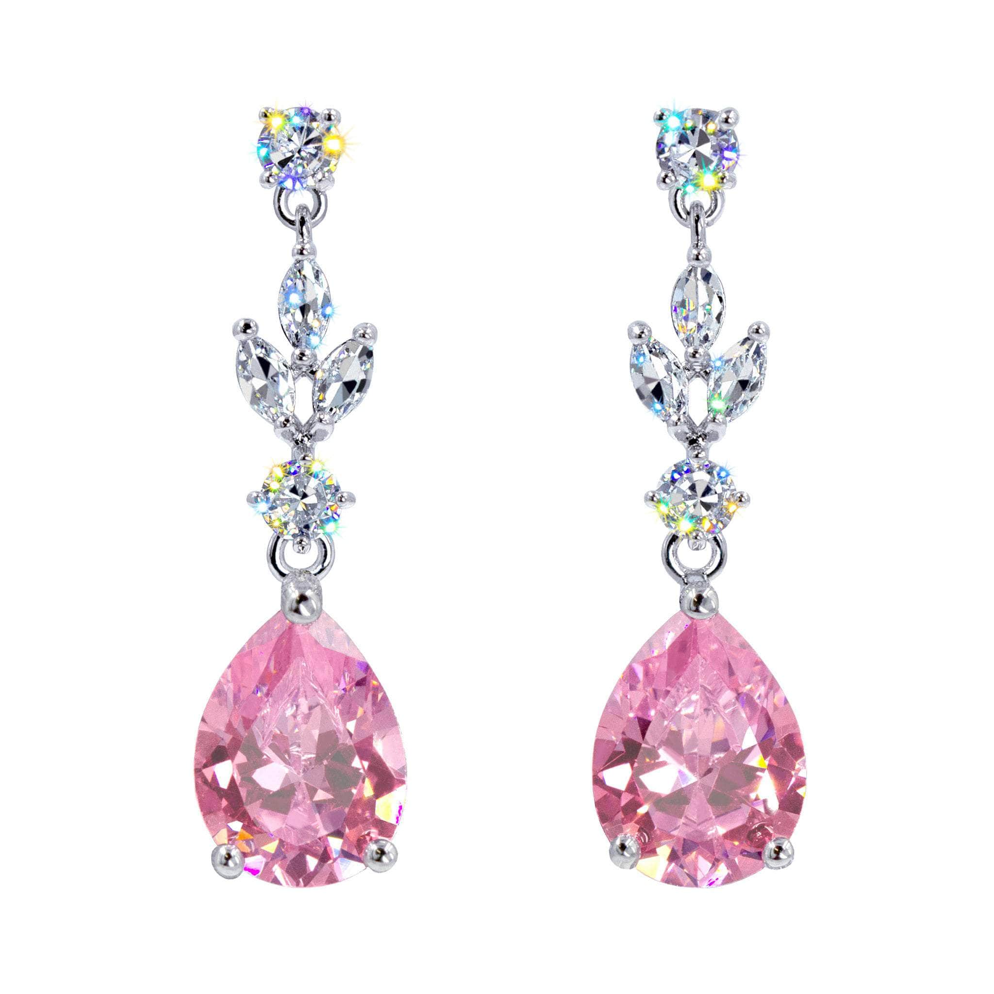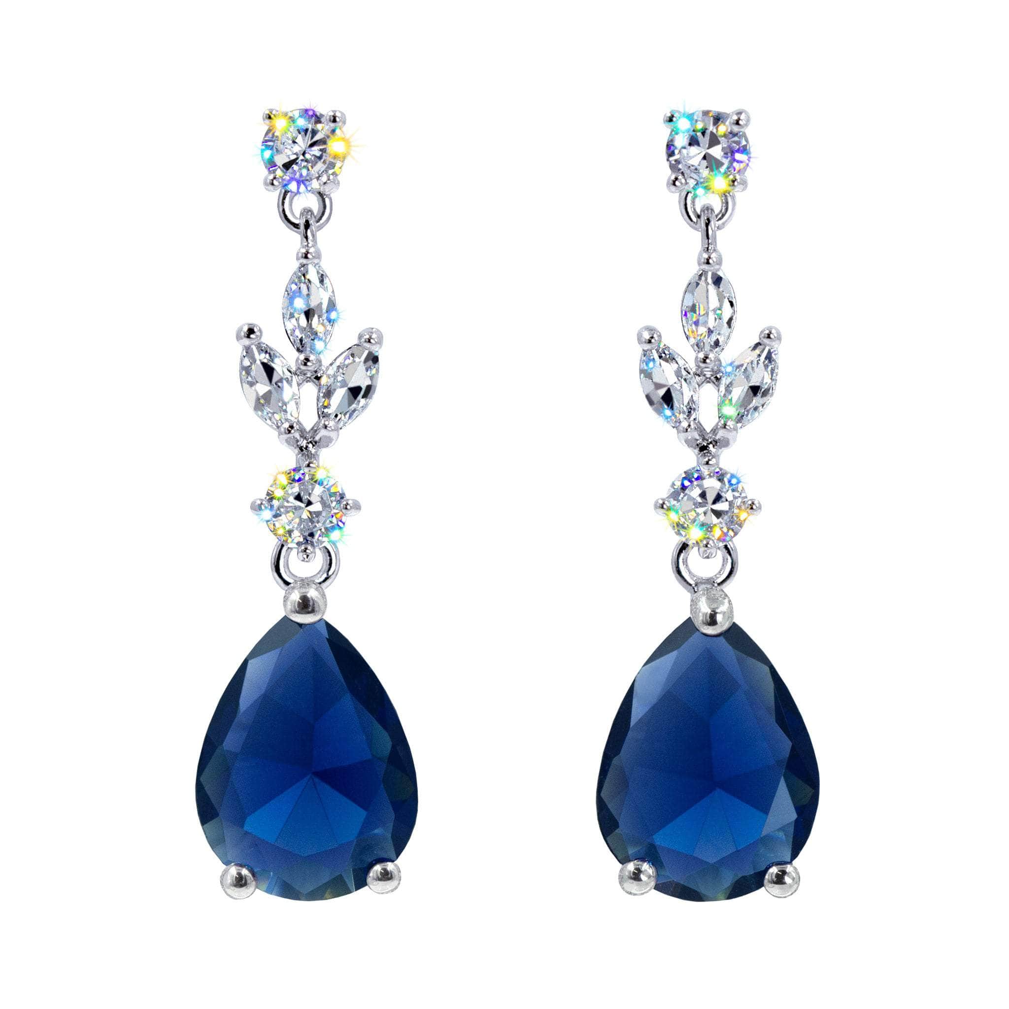 These 1.5" tall chandelier earrings feature a teardrop-shaped CZ stones as the focal point suspended from an intricate arrangement of smaller stones. The smaller stones cascade down to the larger teardrop stone have fluid movement. Plated in imitation rhodium. They exude luxury and are likely intended for formal events, adding a statement piece to an evening or gala ensemble. Carded on RJC cards and in a polybag.